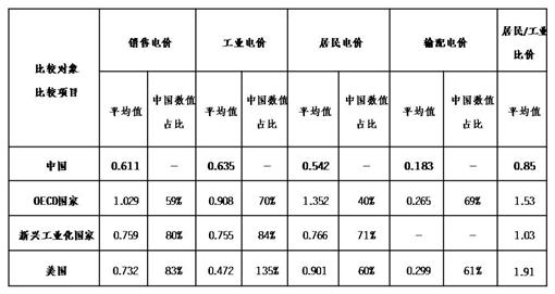 從以上幾組數(shù)據(jù)對(duì)比可以看出,與OECD國家和新興工業(yè)化國家相比,我國電價(jià)明顯處于較低水平;與美國相比,我國電價(jià)總體水平也低于美國。