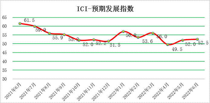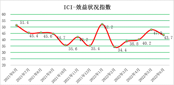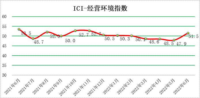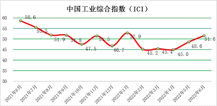 2022年6月份,中國工業綜合指數(以下簡稱ICI)為51.6%,環比回升3.0個百分點,漲至榮枯線之上,表明中國工業經濟運行受到的疫情沖擊逐步消失,防疫政策調整,供應鏈恢復,供需兩端持續向好。生產狀況指數為52.3%,環比回升3.1個百分點,漲至榮枯線之上,企業生產態勢由收縮轉為擴張。效益狀況指數為43.7%,環比回落4.2個百分點,有所回落,繼續位于榮枯線下方,企業效益狀況不佳。經營環境指數為51.5%,環比回升3.6個百分點,結束了七個月的連續回落,漲至榮枯線之上,經營環境問題在一定程度上得到改善。融資難易指數為47.3%,環比回落2.7個百分點,跌至榮枯線之下,表明當前企業融資難融資貴的問題再次顯現,政府如何進行維系、如何持續發揮作用依然是至關重要的。預期發展指數為52.5%,環比回升0.5個百分點,有所回升,繼續位于榮枯線之上,企業預期持續向好。ICI制造業指數為51.2%,環比回升3.5個百分點,制造業運行情況有所改善。