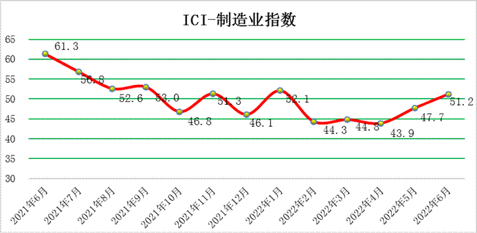 6月份ICI制造業指數為51.2%,環比回升3.5個百分點,漲至榮枯線之上。