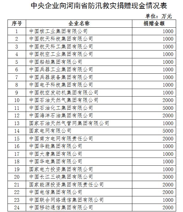 國資委和中央企業堅決貫徹落實習近平總書記關于防汛救災的重要指示精神,落實黨中央、國務院決策部署,全力支援河南省做好汛災搶險救援,進一步加大捐贈力度,截至7月22日19點,89家中央企業累計向河南省捐贈現金達10.44億元。