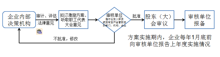 答:股權期權授權日與獲授股權期權首次可行權日之間的間隔(即行權限制期)不得少于1年,股權期權行權的有效期不得超過5年。流程如下: