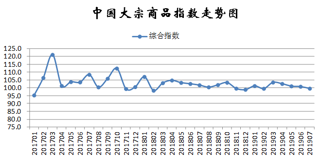 由中國物流與采購聯(lián)合會調(diào)查、發(fā)布的2019年7月份中國大宗商品指數(shù)(CBMI)為99.6%,指數(shù)四連跌至近五個月以來的最低,表明大宗商品市場下行壓力較大。各分項指數(shù)中,供應指數(shù)、銷售指數(shù)繼續(xù)回落,庫存指數(shù)連續(xù)回升,商品價格止跌。從指數(shù)的變化情況來看,隨著高溫多雨天氣增多以及環(huán)保限產(chǎn)全面推進,給供需兩側(cè)均帶來影響,特別是淡季來臨令市場需求縮減更加明顯,市場供大于求的跡象進一步顯現(xiàn),商品庫存持續(xù)積壓。整體來看,8月份大宗商品終端需求難有改善,基本面將繼續(xù)承壓,市場存在進一步調(diào)整的可能,后期隨著利好政策出臺和宏觀預期向好,加之季節(jié)性消費的好轉(zhuǎn),預計市場在充分調(diào)整后有望迎來企穩(wěn)反彈。