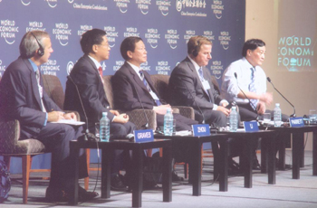 9月13日上午,國資委主任榮融出席了2004年世界經濟論壇。中國企業高峰會中主題為"卓越企業,卓越領導人:中國及世界的挑戰"的大會,并在會上作了題為"加快培育具有國際競爭力的大公司大企業集團"的演講。會上,李榮融還就國有企業內部治理結構改革和加強與外國企業合作等問題回答了主持人和其他與會代表的提問。