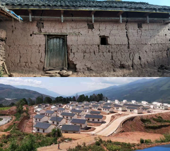 普格縣文坪鄉(xiāng)砂鍋坪村貧困戶過去居住的土坯房和即將完工的文坪新村。