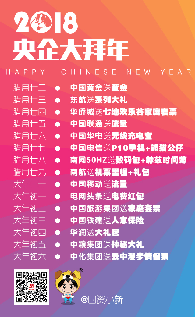 2018年春節期間,國務院國資委新聞中心“國資小新”聯合部分中央企業通過新媒體平臺再次推出“央企大拜年”系列粉絲互動活動,從臘月二十二(2月7日)到大年初六(2月21日),持續為粉絲送祝福、送年貨。