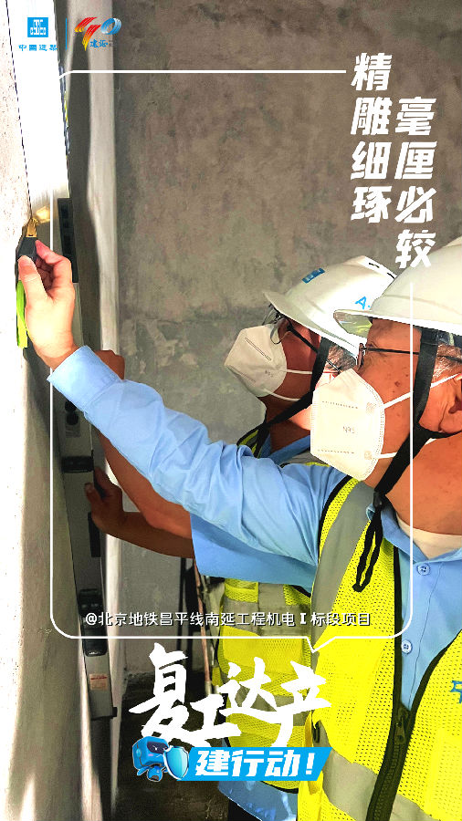 在北京地鐵昌平線南延工程機電Ⅰ標段項目,中建安裝建設者正在測量二次結構墻面抹灰平整度。