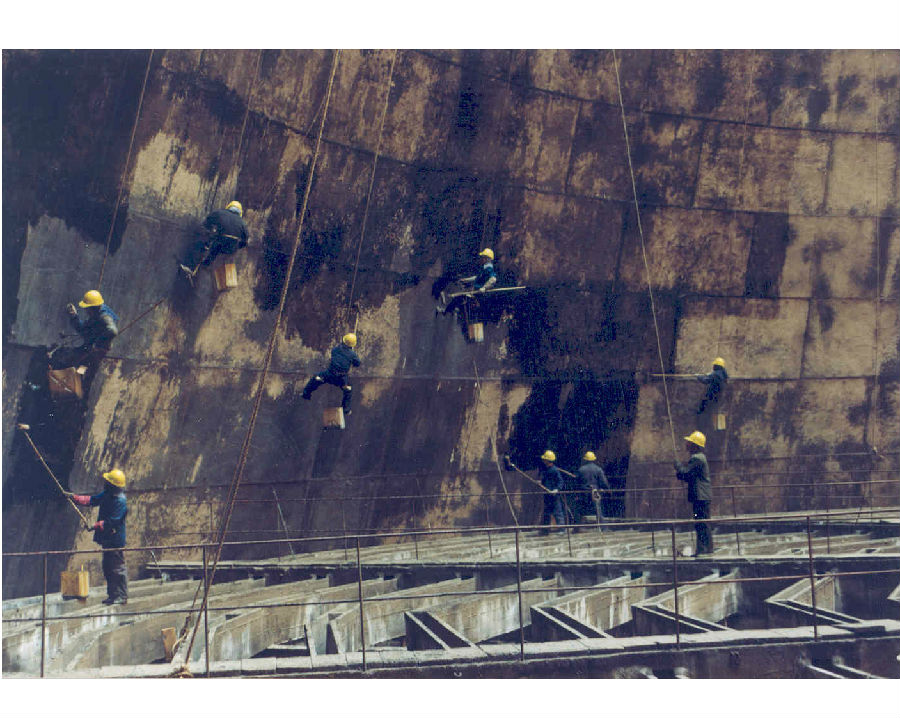 上世紀90年代初期萊蕪電廠工人正在進行冷卻塔內(nèi)部防腐施工