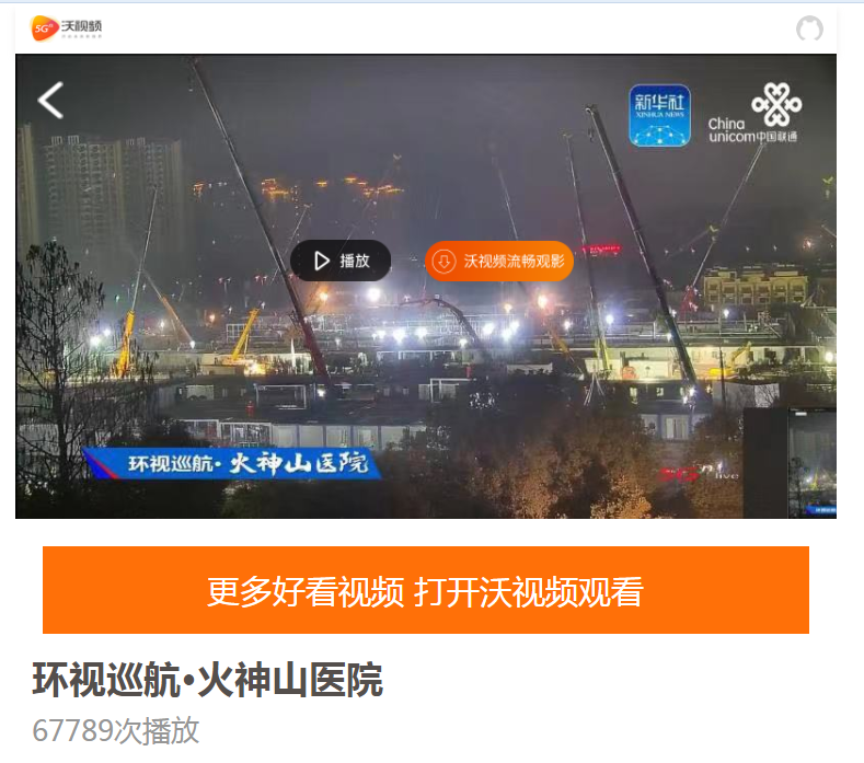 中國聯通聯手新華社、央視網等媒體24小時高清直播武漢火神山、雷神山、黃岡大別山醫院建設情況