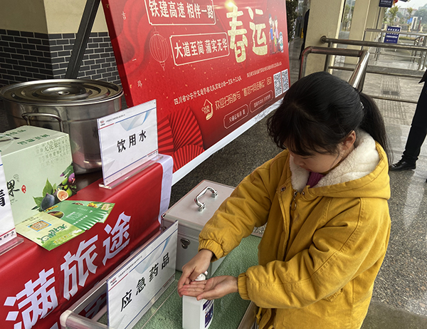 簡蒲高速服務區為過往司乘提供免水洗酒精消毒液。桂佳麗 攝