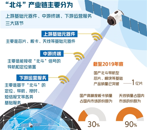 想知道“北斗”的應用前景有多廣闊,首先要搞清楚“北斗”的產業鏈結構。據了解,“北斗”產業鏈主要分為上游基礎元器件、中游終端、下游運營服務3大環節。其中,上游基礎元器件主要是芯片、板卡、天線等基礎元器件;中游終端主要是指能接收“北斗”信號的導航和定位裝置;下游運營服務主要是指為政企用戶、行業用戶、服務商和大眾消費者提供基于“北斗”的定位、導航、授時、短信報文等各類基礎服務。