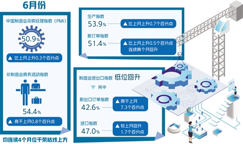6月份制造業PMI為50.9%,連續4個月位于榮枯線上方——
