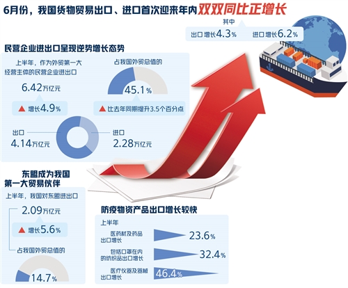 據海關統計,6月份我國貨物貿易進出口同比增長5.1%,其中出口增長4.3%,進口增長6.2%;今年上半年,我國貨物貿易進出口總值14.24萬億元人民幣,同比下降3.2%,降幅較前5個月收窄1.7個百分點。