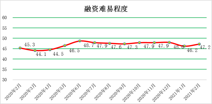 2月份,經營環境指數為54.5%,環比回落0.5個百分點,該指數近一年浮動不大,市場經營環境情況持續向好。具體來看,稅費負擔指數為52.3%,環比下降1.5個百分點,有所回落,連續3個月回落,稅費政策還需深化,但繼續位于榮枯線之上,企業目前稅負情況持續改善;融資難易指數為47.2%,環比上漲1.0個百分點,企業融資環境長期以來并沒有得到改善,說明當前企業融資仍需政府出臺、調整相關政策以改善;市場秩序指數58.5%,環比回落1.9個百分點,持續高于榮枯線且處高位,市場秩序持續改善。