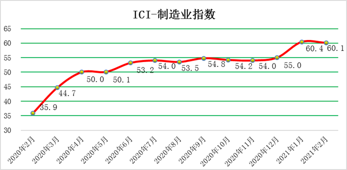 2021年2月份,中國工業綜合指數(以下簡稱ICI)為58.4%,環比下降0.2個百分點,受春節效應影響小幅回落,自去年4月份以來連續位于榮枯線以上,表明中國工業經濟總體持續恢復。生產狀況指數為66.7%,環比上漲1.3個百分點,繼續保持高位,企業生產活動積極平穩進行。效益狀況指數為52.5%,環比下降0.5個百分點,小幅回落。經營環境指數為54.5 %,環比回落0.5個百分點,在保持較高位的基礎上連續位于榮枯線之上,反映了市場經營環境持續改善。融資難易指數為47.2%,環比下降1.0個百分點,持續位于榮枯線下方,且該指數仍低于50%的均衡線,表明當前企業融資難融資貴的問題持續存在,針對此難題還需更有效的貨幣、財政政策等。預期發展指數為59.6 %,環比下降1.8個百分點,有所回落但持續位于榮枯線以上,該指數依舊長期保持高位優勢。ICI制造業指數為60.1 %,環比回落0.3個百分點,但處于高位,自去年4月份以來連續位于榮枯線以上,表明制造業總體持續回暖。