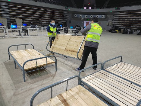 華潤置地志愿者在上海靜安體育中心方艙醫院作業