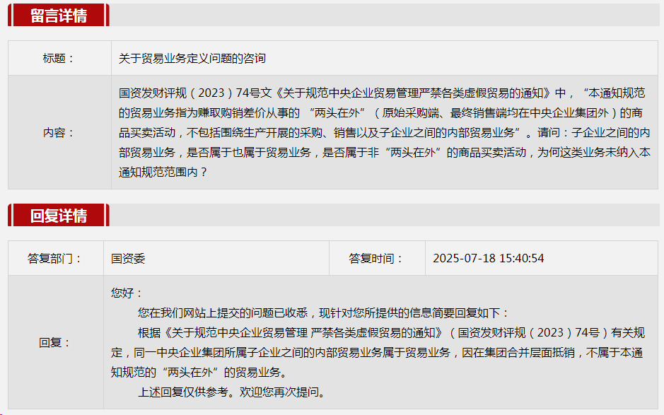 2025年7月國務院國資委網站政務咨詢欄目部分網友提出的咨詢,我們初步做出了認真的回應,現選擇五條關注度高、點擊量高的問題,再次推薦分享。