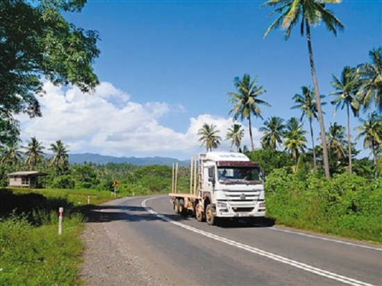 瓦努阿島是南太平洋島國斐濟第二大島。中鐵一局斐濟公司在島上修建的納布瓦魯高速公路和布扎貝高速公路解決了人們出行的“老大難”問題,有力拉動了經(jīng)濟發(fā)展,被斐濟民眾譽為“斐中兩國友好的紐帶”“共同發(fā)展致富的高速路”。圖為一輛卡車行駛在布扎貝高速公路上。(新華社記者 張永興攝)