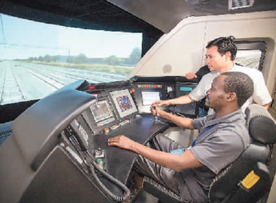 日前,來自泰國、斯里蘭卡、老撾等13個國家的63名鐵路管理人員來到武漢高鐵訓練段進行參訪交流活動。在“一帶一路”背景下,2015年開始武漢高鐵訓練段已舉辦了泰國、老撾等14批涉外鐵路技能培訓班,培訓涉外學員400余人次。圖為來自肯尼亞的賈斯特斯·卡洛·姆文加在高鐵模擬駕駛倉內(nèi)體驗實際操作。(新華社記者 肖藝九攝)