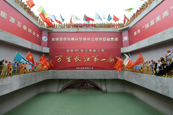 8月21日9時許,長江北岸,江蘇南通,巨大的“卓越號”盾構機翻卷著泥漿駛出過江隧道。這一刻,1000千伏淮南—南京—上海交流特高壓輸變電工程蘇通GIL(氣體絕緣輸電線路)綜合管廊隧道工程貫通。