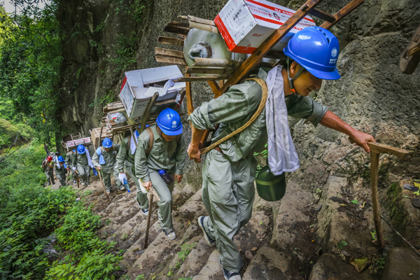 在湖北長陽縣龍舟坪鎮清江南岸嘆氣溝,供電員工背著物料,跋山涉水改造電網。嘆氣溝左邊是高聳的將軍山,右邊是險要的果子巖,中間是一條常年淌著泉水的小溪。供電員工行走在其中,號子聲此起彼伏,響徹嘆氣溝峽谷。長陽縣是國家電網有限公司定點扶貧縣。長陽縣供電公司落實改造升級農村電網等措施,助力脫貧攻堅。李萍攝