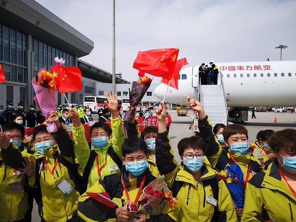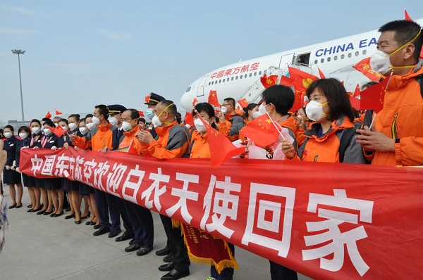 3月24日15:45,當(dāng)天最后一架包機MU7880落地西安咸陽機場,當(dāng)177名醫(yī)護人員走下飛機時,機下的東航員工高高舉起“中國東方航空歡迎白衣天使回家”的橫幅,熱情迎接他們的凱旋歸來。