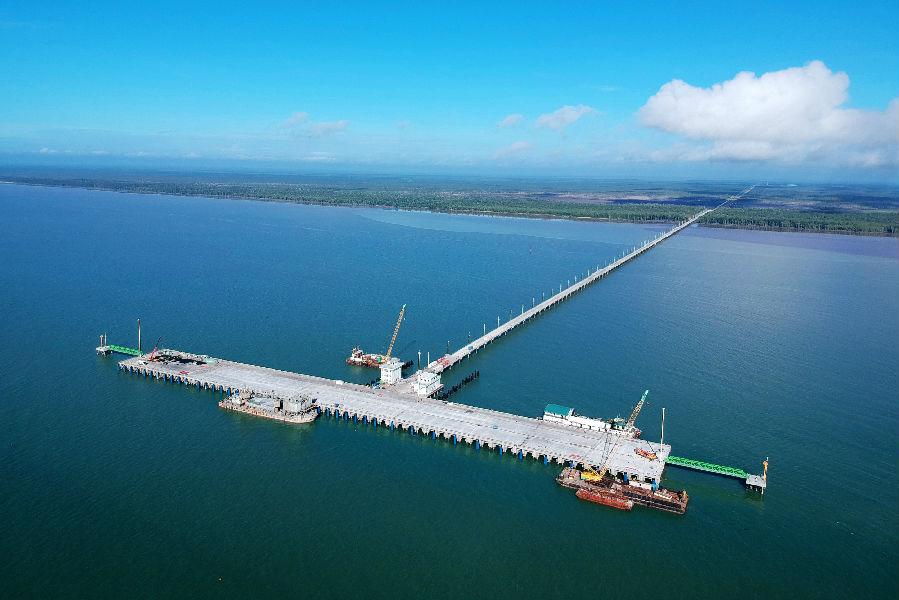 該項(xiàng)目位于印尼蘇門答臘島南部,邦加海峽西側(cè),主要新建1個(gè)長(zhǎng)450米、寬50米的碼頭平臺(tái),1座長(zhǎng)3029米的接岸引橋及相關(guān)配套設(shè)施。施工過(guò)程中,該項(xiàng)目人員克服大型施工船舶無(wú)法在紅樹林保護(hù)區(qū)域內(nèi)展開鋼管樁沉樁和橫梁施工等難題,集思廣益,最終確定先用100尺駁船配合2臺(tái)挖機(jī)進(jìn)行河道整平工作,再用150尺駁船配合150噸履帶吊從首排架向海側(cè)進(jìn)行樁基橫梁施工,確保碼頭主體工程順利完工。