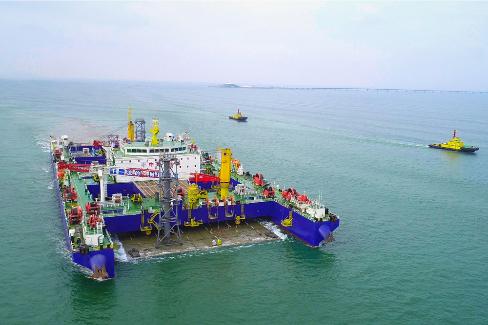 相較于E1、E2管節,E3管節的安裝首次進入海平面20米以下深水區。安裝過程中,由世界最大最先進自升式的碎石鋪設整平船“一航津平2”首次在國內采用半漂浮方式作業,順利完成基床整平,在有效保障工期的同時,填補了該領域的技術空白。