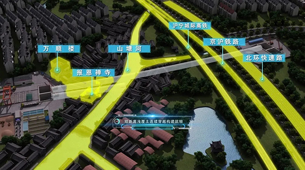 在桐涇路隧道方案沒有確立以前,打通這條路要面臨萬順樓、報(bào)恩禪寺等古建、山塘河以及運(yùn)行中的滬寧城際高鐵、京滬鐵路、北環(huán)快速路等重大風(fēng)險(xiǎn)點(diǎn)。僅地上這些難點(diǎn),每一項(xiàng)難度可以說都是“S級(jí)”,而且都集中在這短短的400多米長(zhǎng)度內(nèi),尤其是滬寧城際鐵路是一條運(yùn)行時(shí)速350公里的高鐵,更是容不得半點(diǎn)閃失。所以打通“斷頭路”不僅僅是決心的問題,更是對(duì)中國(guó)基建技術(shù)實(shí)力的考驗(yàn)。