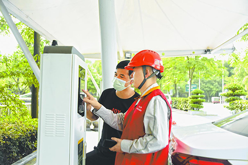 國網重慶電力員工在銅梁新城充電站向車主介紹充電樁功能。