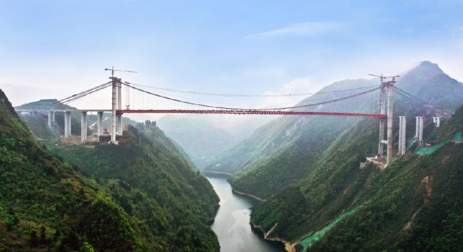 其中控制性工程陽(yáng)寶山特大橋全長(zhǎng)1112米,為主跨650米的鋼桁梁懸索橋,也是貴州省首座采用雙向六車道高速公路標(biāo)準(zhǔn)建設(shè)的懸索橋。