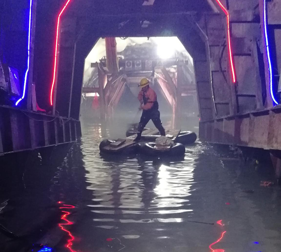 2020年3月13日,將軍寨隧道掘進時,突發涌水,最高涌水面至一號斜井3號泵站,涌水高度達50米,最大涌水量可達6100m3/h,總涌水量281萬方。險情發生后,項目部緊急組織人員和設備撤離,并立即成立突發涌水處理攻關小組,加強洞內抽排水,歷經一個月,抽水工作圓滿完成。