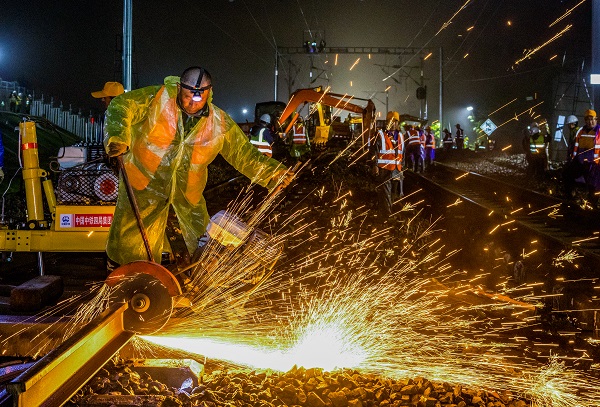 4月26日晚10點30分,隨著中國鐵路上海局集團有限公司東華地鐵公司現場總指揮的一聲令下,來自中鐵四局等單位的土建、軌道、防護、精調等多個工種的1000余名鐵路建設者迅速開展扒除、鋸軌、線路撥移、鋼軌合龍、填充道碴、大機搗固、開通試驗等施工作業。
