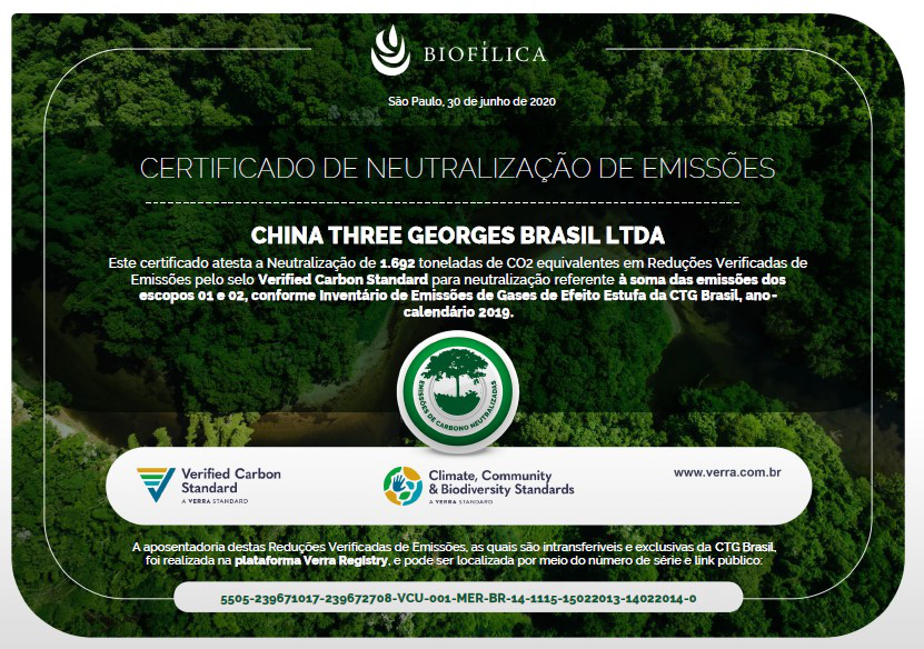 根據該報告,2019年,三峽巴西公司辦公區域及所有控股電站累計直接排放二氧化碳1691.79噸。通過與葡電巴西公司合作支持加利谷森林地區保護項目,三峽巴西公司實現了1691.79噸的碳抵消。從直接碳排放量角度,2019年,三峽巴西公司實現100%碳中和。