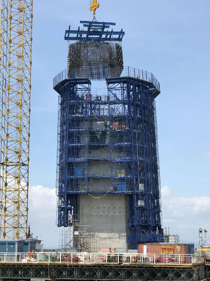 大橋分為東西兩個索塔,每個塔高270米,建成后將成為世界最高海中大橋,東索塔塔柱為鋼筋混凝土結構,共澆筑混凝土約5萬立方米,鋼筋用量高達7400噸,相當于一座埃菲爾鐵塔。