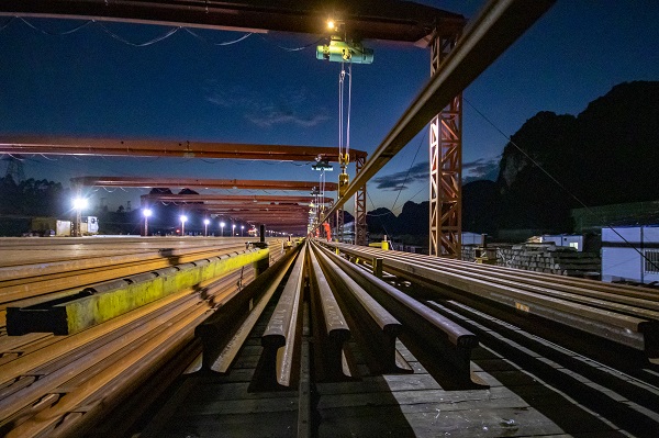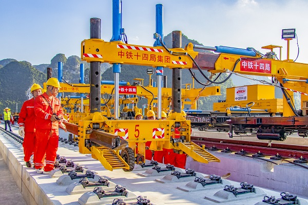 貴南高鐵廣西段沿途為典型的喀斯特地形,穿越110多座橋梁,45座隧道,橋隧比高達90.3%,對鋪軌作業帶來巨大考驗。為加快鋪軌進程,中鐵十四局聯合廠家研發新型多線鋪軌一體機,同時引進多臺先進鋪軌設備,與傳統無砟鋪軌機聯合作業,施工效率提高了50%。自2022年8月鋪軌以來,項目團隊嚴格標準化管理,不斷加大科技攻關,持續創新工裝工藝,創下了日鋪軌最高達12公里的佳績,提前15天完成了南寧至河池段既定的鋪軌任務。