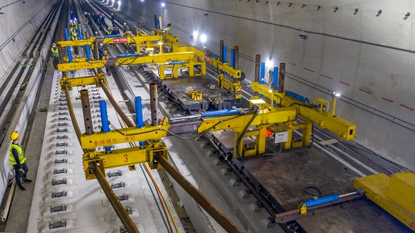 圖為多線鋪軌一體機在貴南高鐵大方山隧道內作業