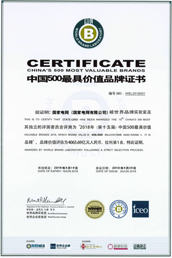 6月20日,由世界經理人集團(World Executive Group)、世界品牌實驗室(World Brand Lab)聯合主辦的2018年(第十五屆)世界品牌大會在京舉行。會上發布2018年《中國500最具價值品牌》排行榜,國家電網品牌以4065.69億元的價值蟬聯榜首,品牌價值較上年增長766.82億元,連續12年攀升。這是國家電網品牌連續三年位居該榜榜首。