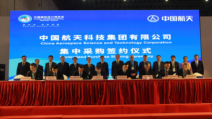11月6日,首屆中國(guó)國(guó)際進(jìn)口博覽會(huì)期間,中國(guó)航天科技集團(tuán)有限公司舉行集中采購(gòu)簽約儀式,集團(tuán)公司所屬10家企業(yè)與來(lái)自全球9個(gè)國(guó)家以及中國(guó)香港、中國(guó)臺(tái)灣地區(qū)的13家企業(yè)集中簽署了16個(gè)項(xiàng)目的采購(gòu)合同或協(xié)議,全面推動(dòng)中國(guó)航天與全球產(chǎn)業(yè)鏈的互動(dòng)與合作。16個(gè)簽約項(xiàng)目涵蓋航空物流、新材料、先進(jìn)傳感、新能源、特種裝備等多個(gè)領(lǐng)域,簽約合作方為俄羅斯、美國(guó)、法國(guó)、意大利、韓國(guó)、阿聯(lián)酋、日本、德國(guó)、瑞士等國(guó)企業(yè)以及中國(guó)香港、中國(guó)臺(tái)灣地區(qū)企業(yè)。