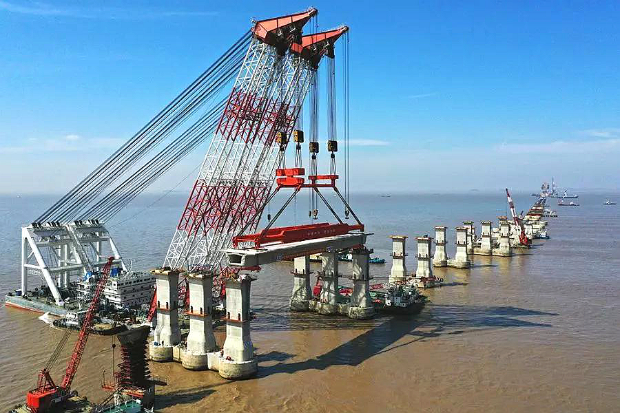 4月18日,一榀長69米、寬12.55米、重達1800余噸的預制箱梁,被四航奮進號2600噸起重船緩緩提起,安全、精準地落至寧波舟山港主通道舟岱跨海大橋NZ24號和NZ25號墩上。至此,浙江省交通集團成功完成首榀全國最重最長跨海大橋預制箱梁架設。