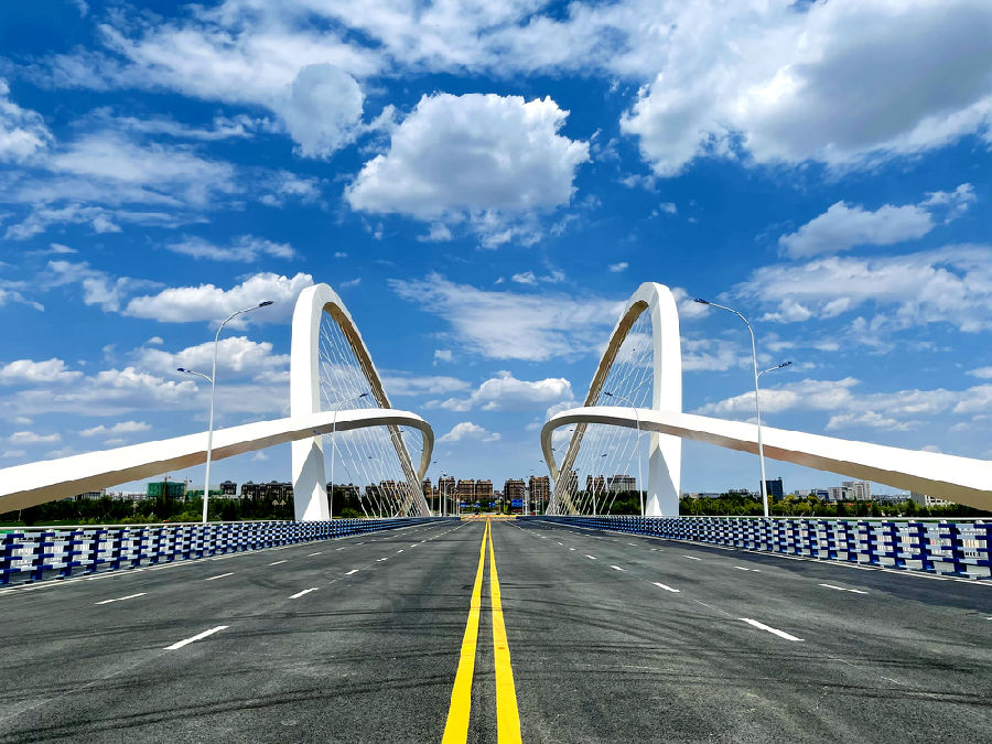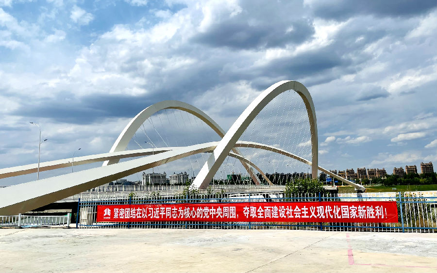 烏蘭木倫河3號橋全長348米,是中承復式鋼箱拱橋,半漂浮體系,設計通車時速為50公里/時,橋梁獨立的人行道和觀景平臺呈雙飛翼造型,橋型新穎美觀、技術難度大、科研價值高,開創了在高原地區建設結構復雜的大跨徑拱橋先例。