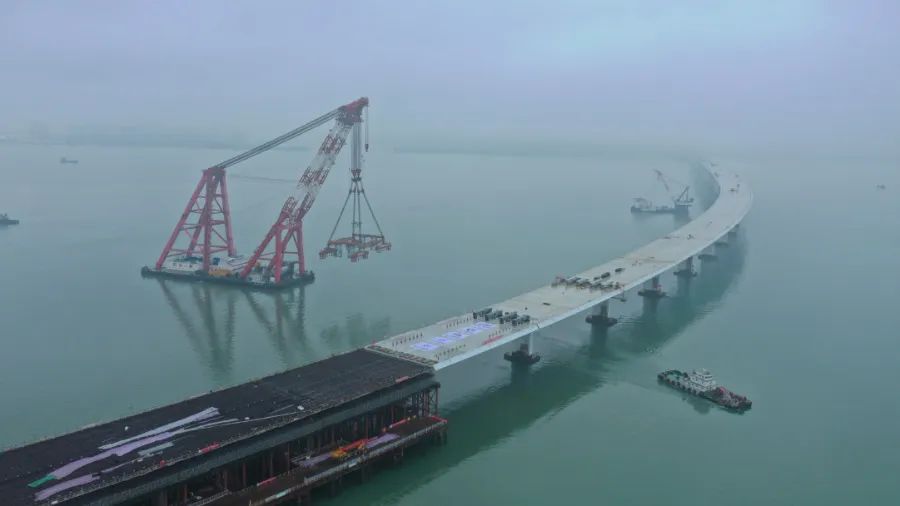 6月9日,翔安大橋A3標海中段最后一榀鋼箱梁完成吊裝。
