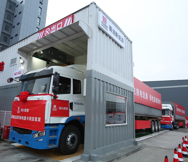 成渝電走廊充換電重卡項目在成都龍泉民生物流園、成渝高速資中停車區等4處建設6座充換電站,能有效解決新能源重型卡車補能效率低、補能時間長、補能設施匱乏等痛點,節約物流成本30%,是全國第一條高速公路新能源重卡充換電一體化走廊、第一個由高速公路公司主導的電池銀行項目,也是助推成渝地區雙城經濟圈建設的第一個綠色能源集卡項目。目前,資中停車區和龍泉民生物流園充換電站已建成開通,適配于大部分新能源重卡車型,換電過程僅需3-5分鐘,自動換電成功率達99%,24小時內最高可換電次數達168次。項目第二階段計劃于2023年第二季度末建成重慶永川服務區、重慶果園港充換電站,全線打通全國首條高速公路電走廊。