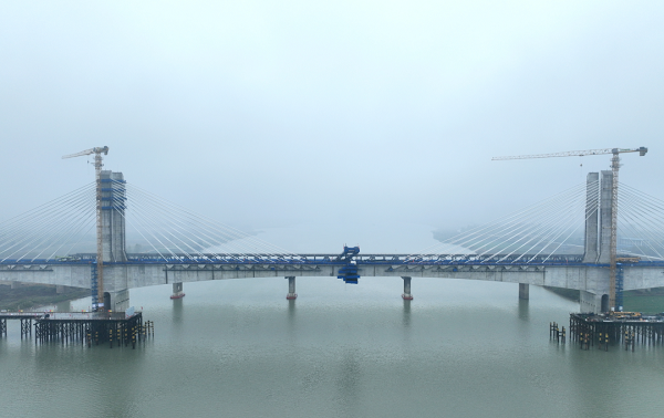 淮宿蚌城際鐵路淮河特大橋全長10738米,其主橋長497.5米,跨徑布置為(124+248+124)米預應力混凝土矮塔斜拉結構形式,橋址距下游的京滬高鐵淮河大橋約1000米,是全線重難點工程之一。主橋雙墩扎根于淮河之中,高達47.1米的兩座主塔矗立其上,塔頂設有10對斜拉索連接29個主梁節段,構建出簡潔大氣的整體造型,是目前淮河已建成跨度最大的鐵路橋。