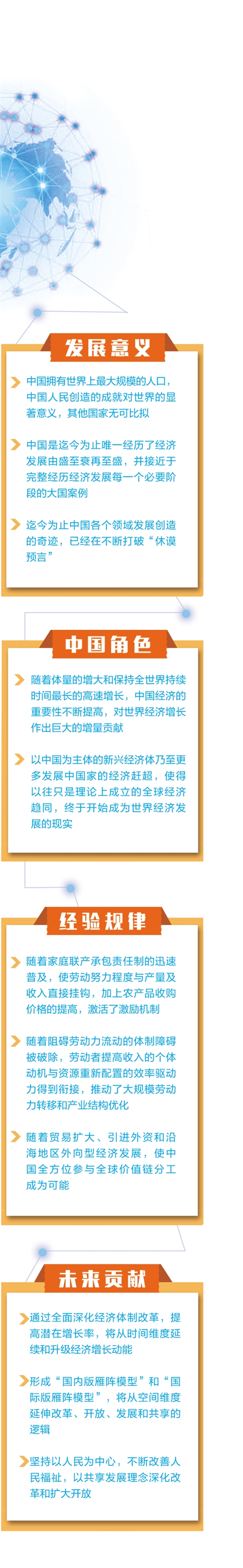 中華人民共和國已經走過70年的光輝歷程,經濟發展有前30年的探索及其教訓,也有后40年的創新及其經驗。無論是走過的彎路還是取得的成功,在知識意義上都是寶貴的財富,值得我們自己珍視,也應該貢獻給正在進行同樣探索的其他發展中國家,并且值得寫入發展經濟學的最新版本。根據已經提煉的智慧,按照既定的方向和目標,依據相同的改革開放邏輯和路徑,中國仍將繼續進行實踐探索,爭取對世界作出新的更大的貢獻。