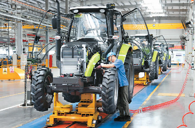 位于安徽蕪湖三山經(jīng)濟(jì)開發(fā)區(qū)的中聯(lián)重科重機(jī)公司,中國工人在組裝自主研發(fā)的拖拉機(jī)。這些拖拉機(jī)將出口東南亞、非洲、南美等海外市場。(人民視覺 程依寶攝)