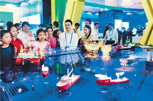 圖① 科技活動周上展示的中海油海洋深水油氣勘探開發模型吸引了許多小朋友的目光。(郭靜原攝)