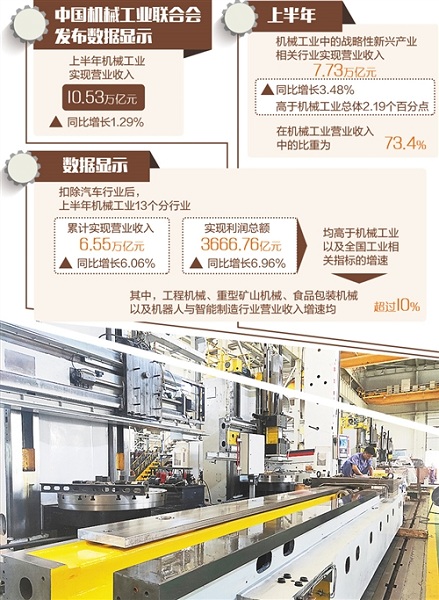 中國機械工業聯合會近日發布的數據顯示,上半年機械工業實現營業收入10.53萬億元,同比增長1.29%。中機聯執行副會長陳斌表示,機械行業發展穩步推進,但問題和壓力依然存在。初步預計全年經濟運行總體將比較平穩,工業增加值力爭達到6%左右,營業收入、利潤總額及進出口貿易保持適度增長。