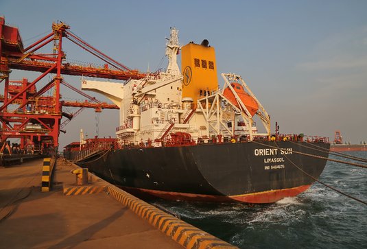 一艘輪船靠泊在秦皇島港礦石碼頭卸載。(記者 楊世堯 攝)