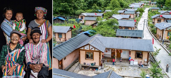 這是一張拼版照片。左圖:怒江傈僳族自治州貢山縣獨龍江鄉迪政當村獨龍族的“文面女”李文仕(前排左)一家合影(6月21日攝);右圖:李文仕和其他村民的房子(6月21日攝),這些房子是當地政府在2011年統一修建的。新華社記者 江文耀 攝