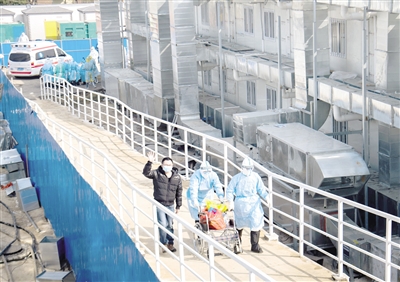 2月4日,醫(yī)護(hù)人員將患者送入病房。當(dāng)日,武漢火神山新型冠狀病毒感染肺炎專科醫(yī)院開始正式接診新型冠狀病毒感染的肺炎確診患者。(記者 肖藝九 攝)